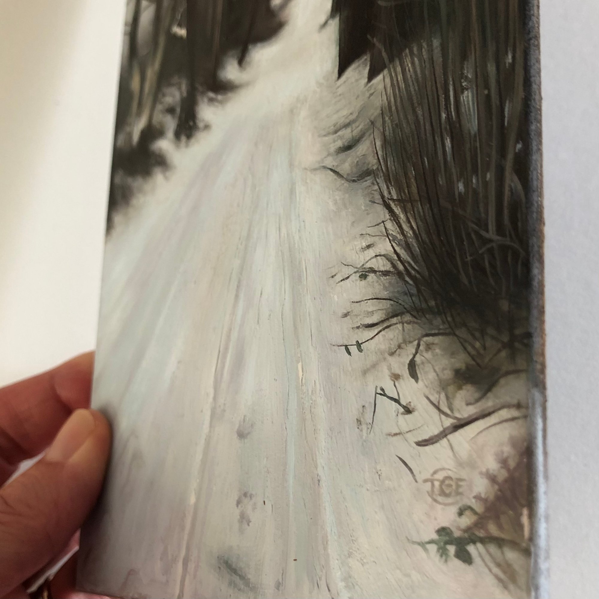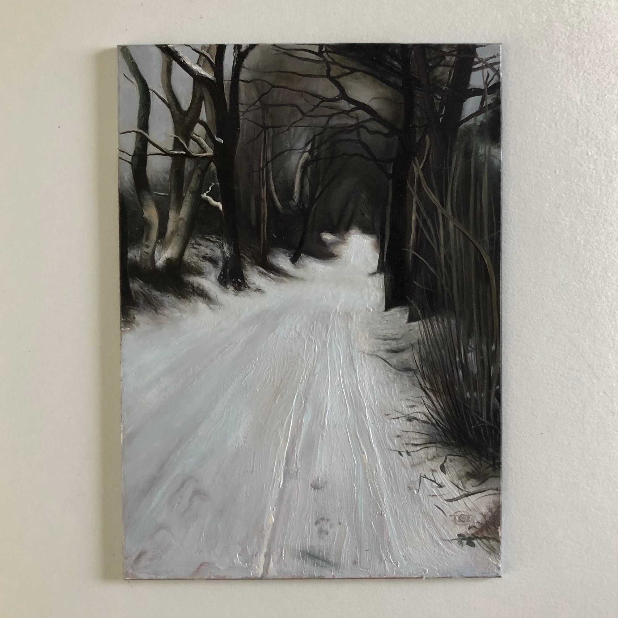Snow at The Devil’s Punch Bowl, Hindhead. 5x7” oil on gesso board. Unframed, unpainted sides- see photos.