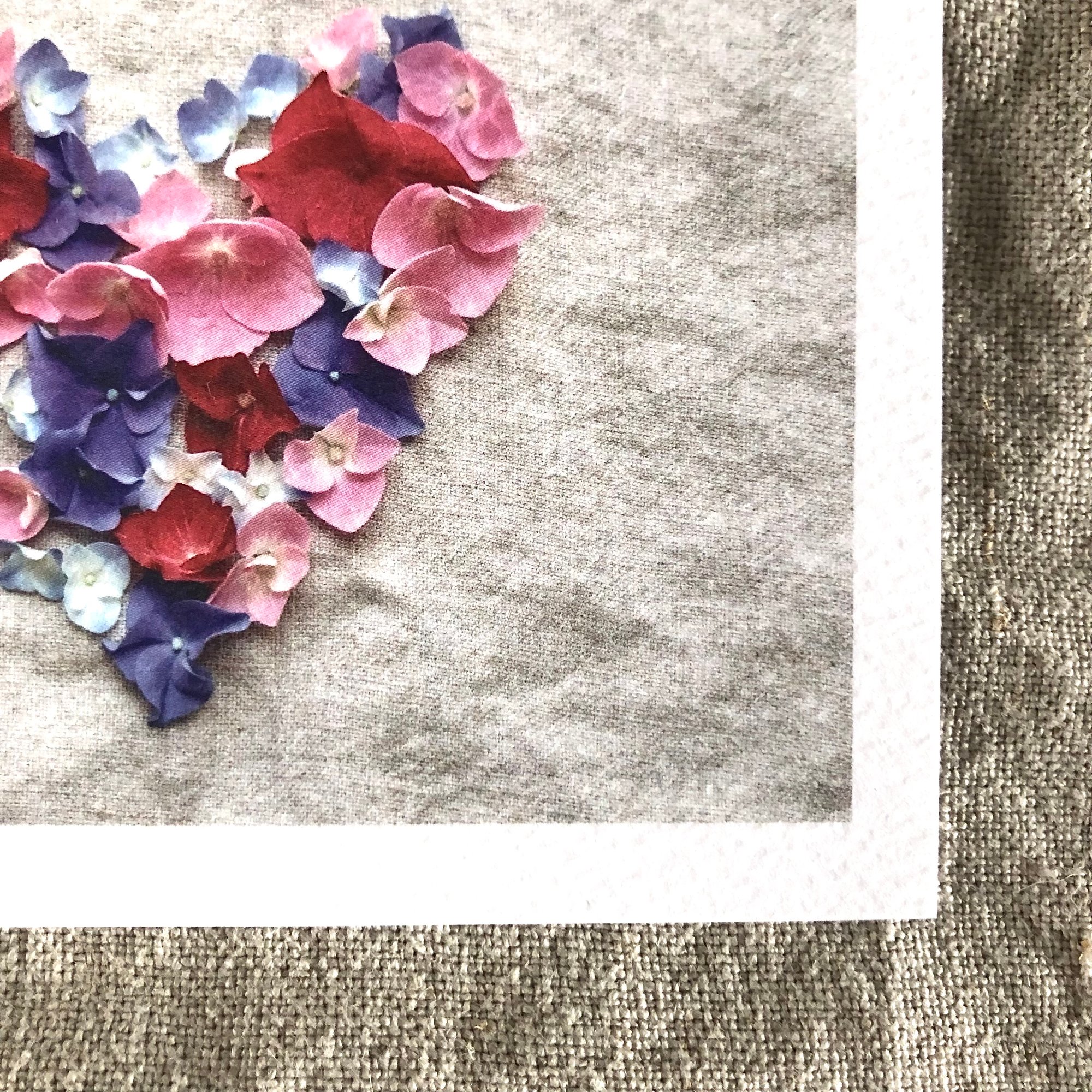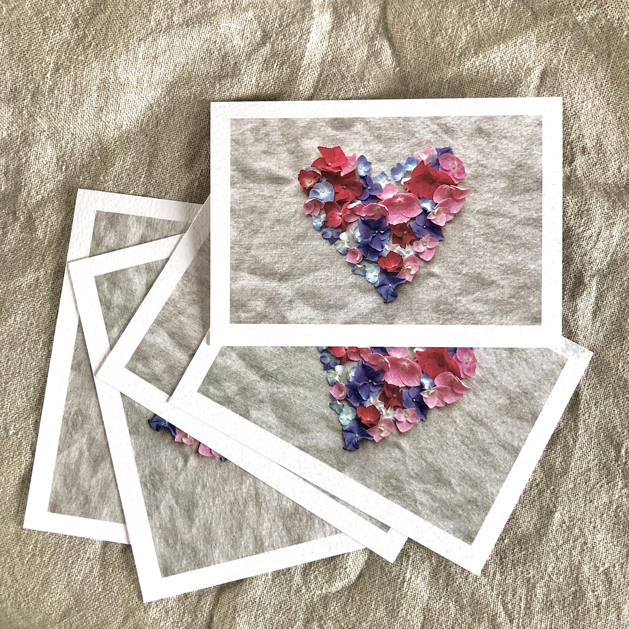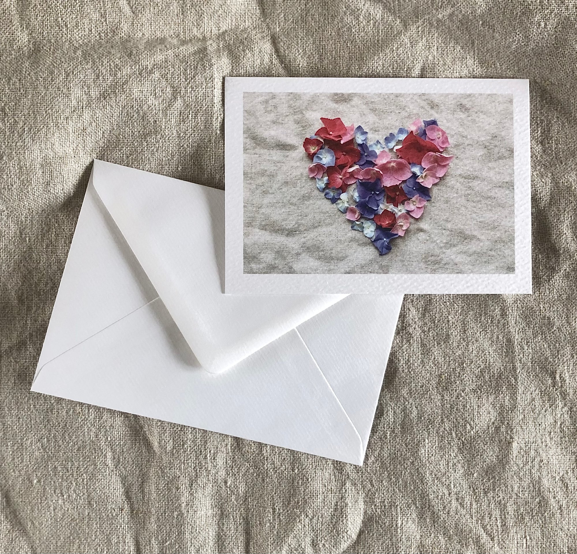 Pack of five beautiful note cards. Photo design features Hydrangea petals on natural linen background. A6 (10.5x14.8cms) with envelopes. Plain on reverse. Printed on beautiful, textured card.