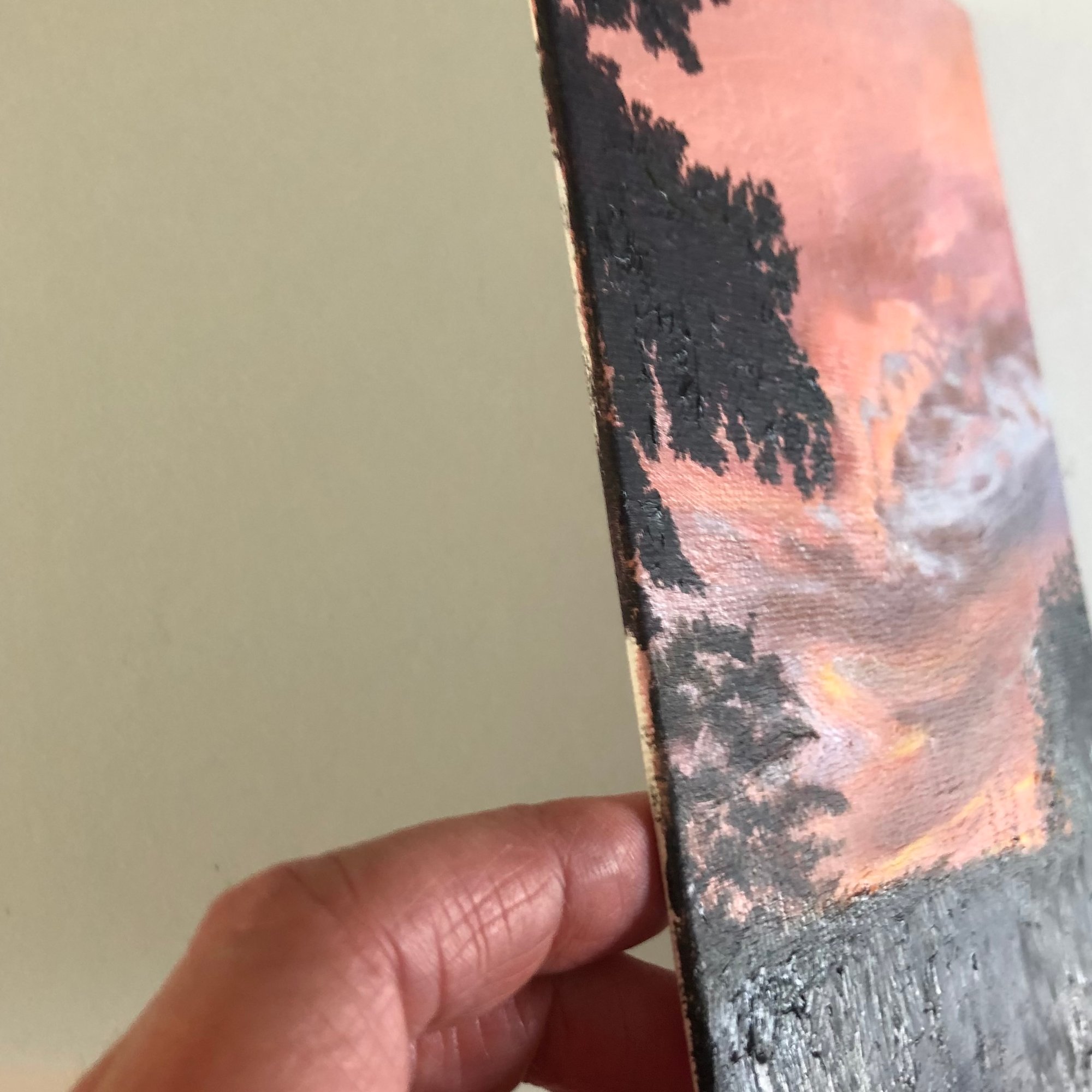 5x7” oil on canvas board. Evening view over my garden. Unframed, unpainted sides. See photos.